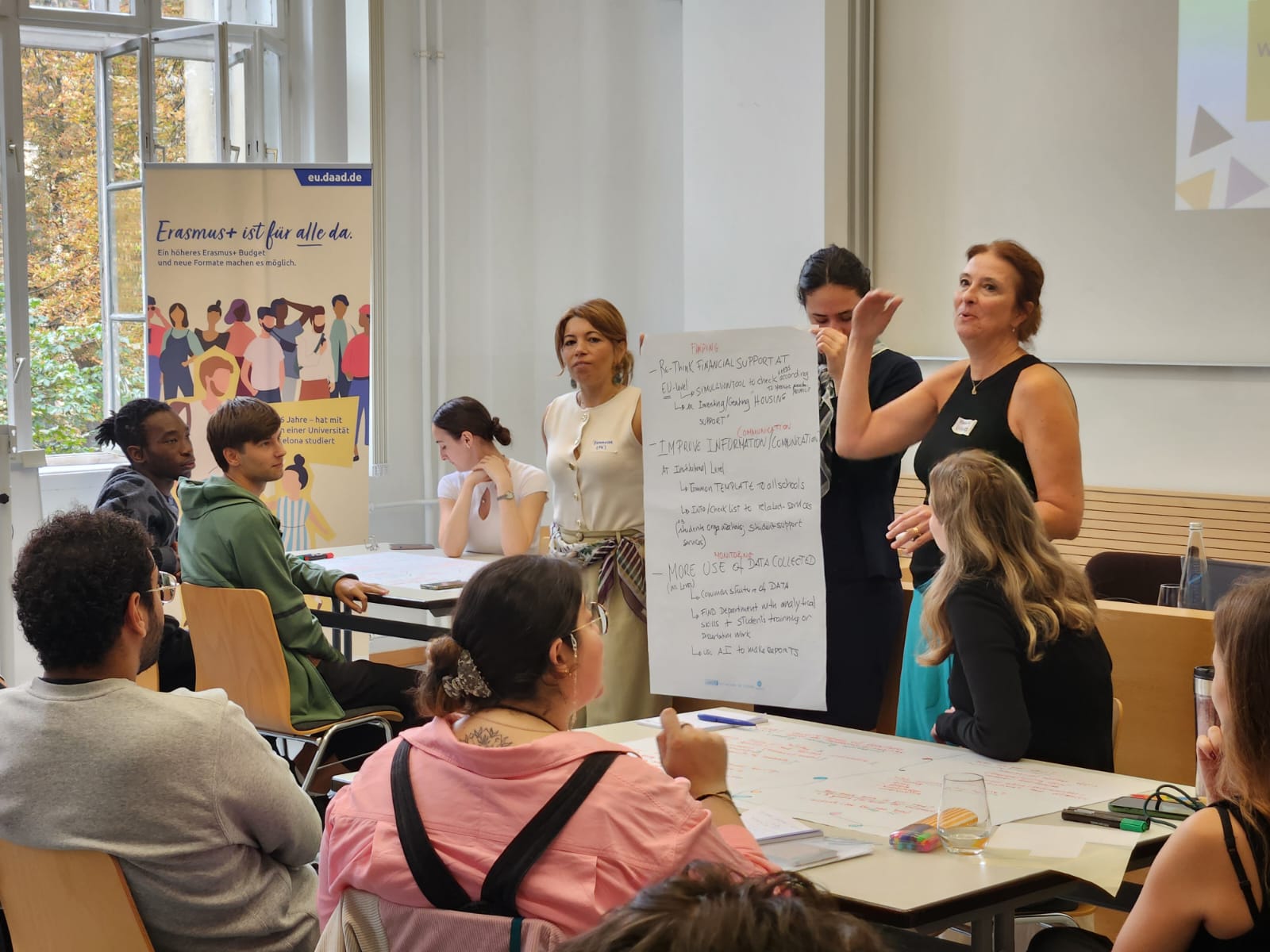 Guidés par les objectifs des ateliers, les participants ont co-créé des initiatives concrètes pouvant être mises en œuvre dans leurs contextes institutionnels pour traiter les inégalités dans la mobilité d’apprentissage : des campagnes de diffusion et des activités de pair à pair avec d’anciens étudiants Erasmus, jusqu’à l’amélioration des compétences interculturelles des membres du personnel pour accueillir les étudiants internationaux.