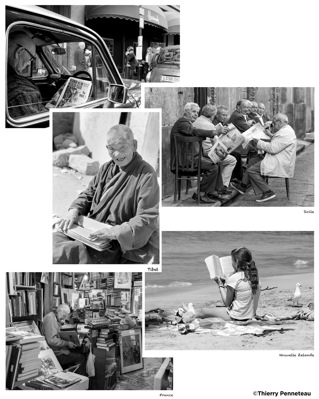 Au fil de ses 96 voyages, Thierry Penneteau a photographié ces moments de lecture pour montrer la diversité des habitudes, des lieux et des cultures. Dans la rue, dans les transports, sur un banc, à l’ombre d’un temple ou au cœur d’une ville animée : partout, la lecture rassemble.