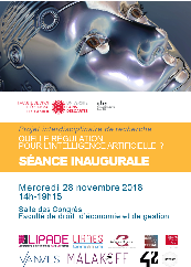 | Séance inaugurale du projet 'Quelle régulation pour l'intelligence artificielle?' - Université Paris Descartes 28 novembre 2018 L'Université Paris Descartes et ses partenaires présentent le 28 novembre 2018 leur projet de recherche portant sur la régulation de l'intelligence artificielle. | |