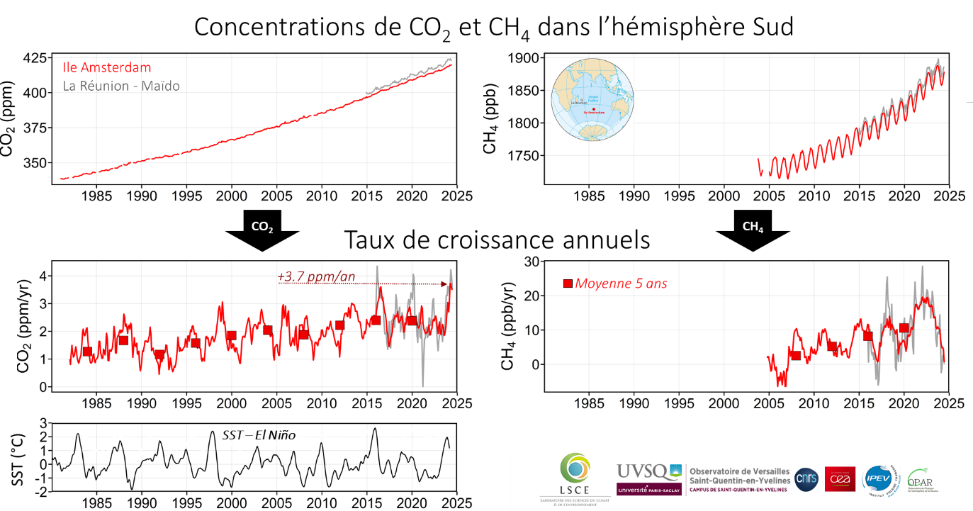 Ces perturbations climatiques se traduisent par une accélération temporaire de la croissance du CO2, qui s'ajoute aux émissions d'origine humaine responsables de l'augmentation des concentrations observée partout, y compris dans des observatoires très éloignés comme l'île Amsterdam et l'île de la Réunion. Du côté du méthane, les concentrations dépassent désormais 1850 ppb3 à l'île Amsterdam. Si sa croissance s'est modérée ces derniers mois (moins de 5 ppb/an), elle avait atteint des niveaux records entre 2020 et 2022 (plus de 15 ppb/an).