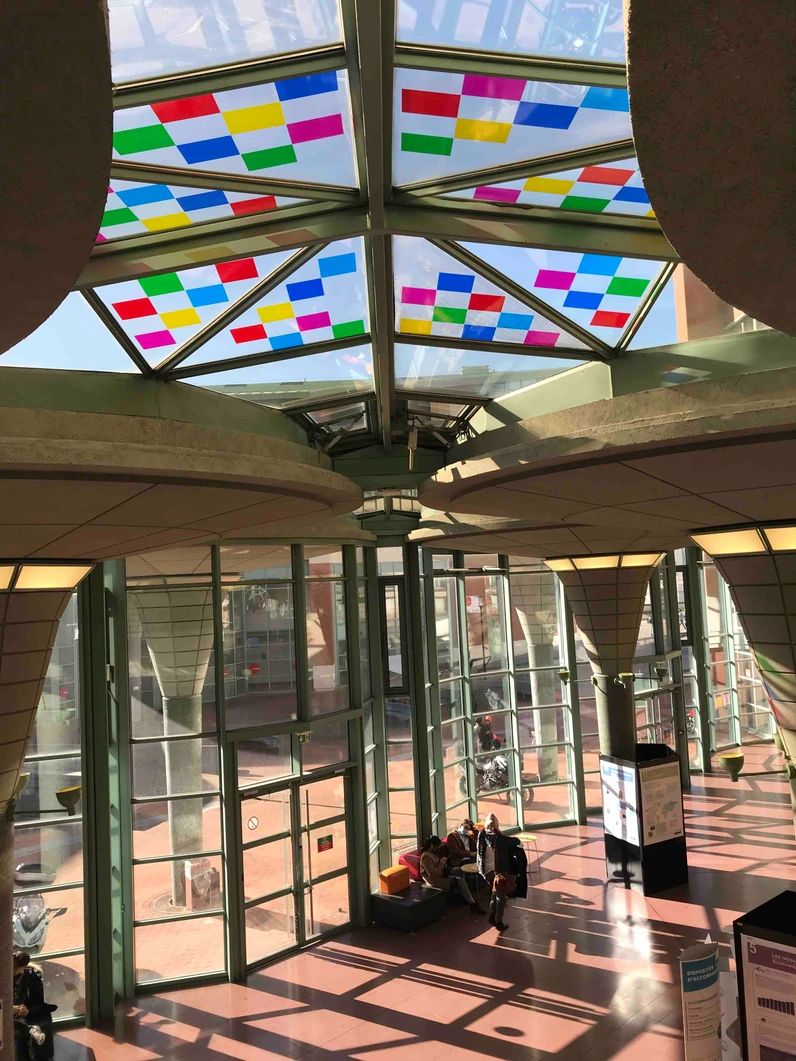 "Architectural: "Suites chromatiques" by Ségolène Perrot - an architectural installation that transforms the Saint-Quentin-en-Yvelines campus through colorful window decals, interacting with light, space, and the rhythm of the buildings to create dynamic visual experiences throughout the day and seasons."