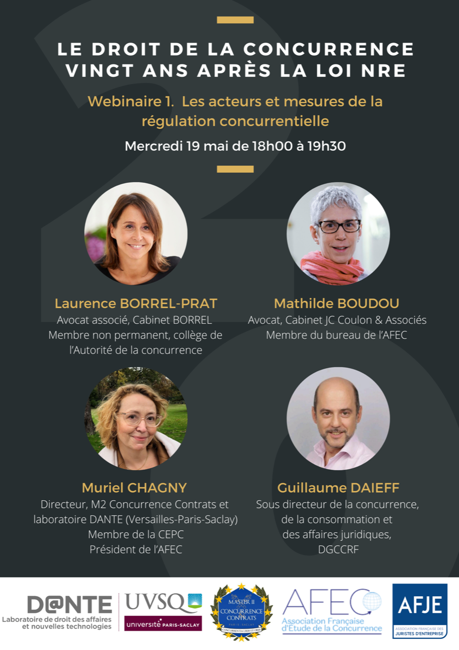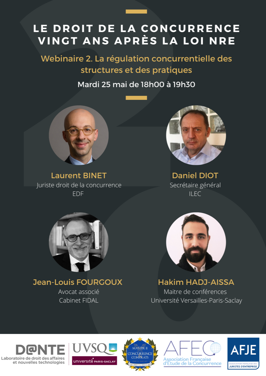 Le Master 2 Droit de la concurrence et des contrats organise en partenariat avec le Laboratoire de Droit des Affaires et des Nouvelles TEchnologies, l'AFEC - Association française d'étude de la concurrence et l'AFJE un colloque en ligne : « Le droit de la concurrence, vingt ans après la loi NRE » le mercredi 19 et le mardi 25 mai 2021 en ligne.