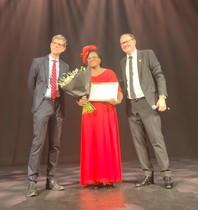 Dr. Zinsi Christiane Augustine KOUDOUKPO, Dermatologist, Venereologist, and Lecturer-Researcher at the University of Parakou (BENIN), with Dr. Philippe CHARLIER (left) and Dr. Stéphane FAUVERGHE, Global Medical Director of NAOS (right), during the award ceremony.