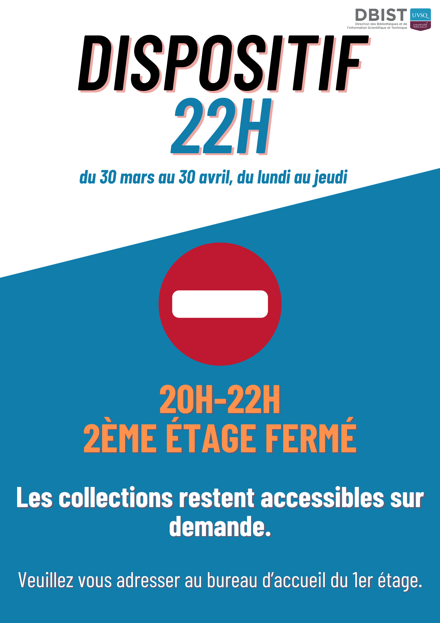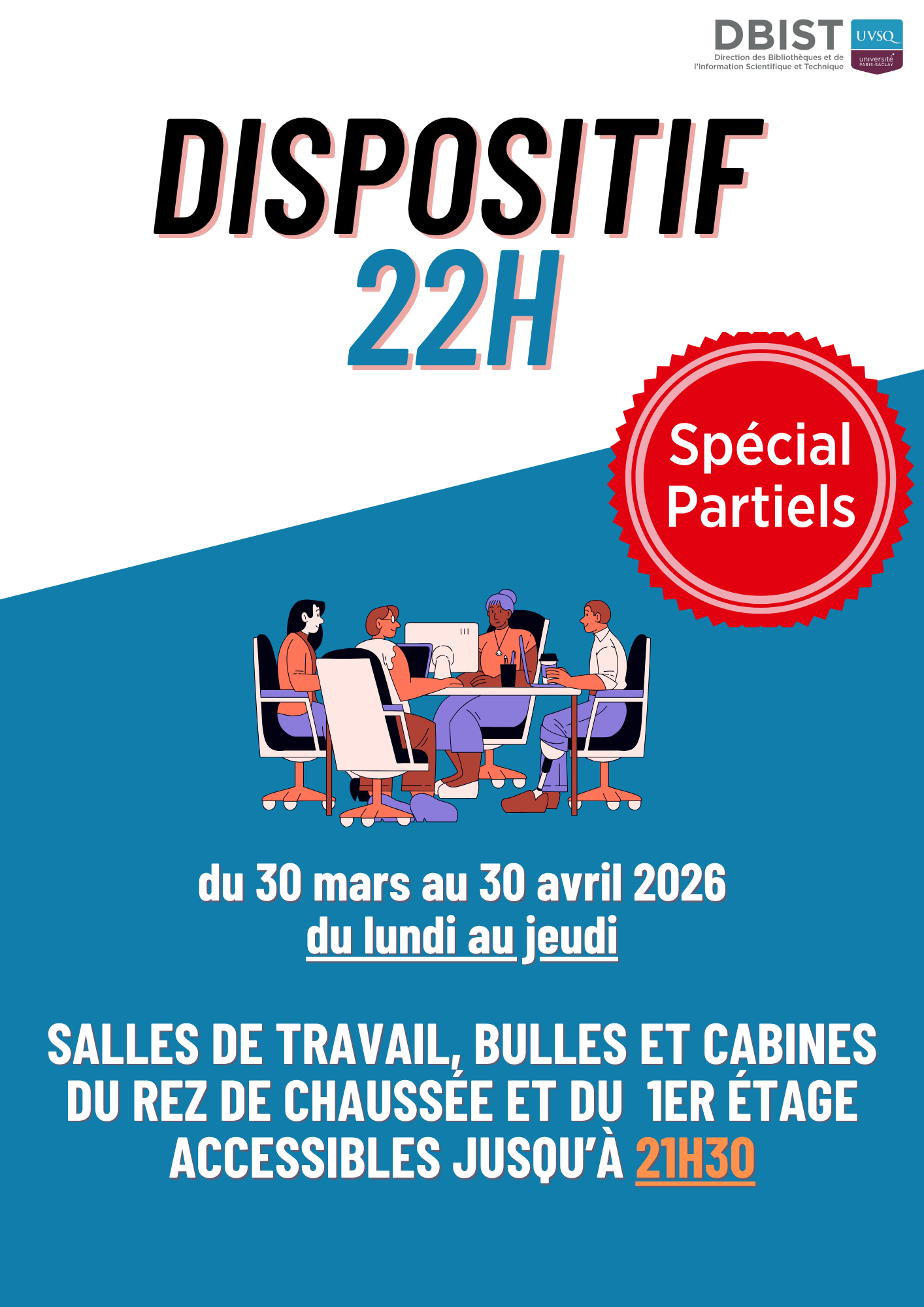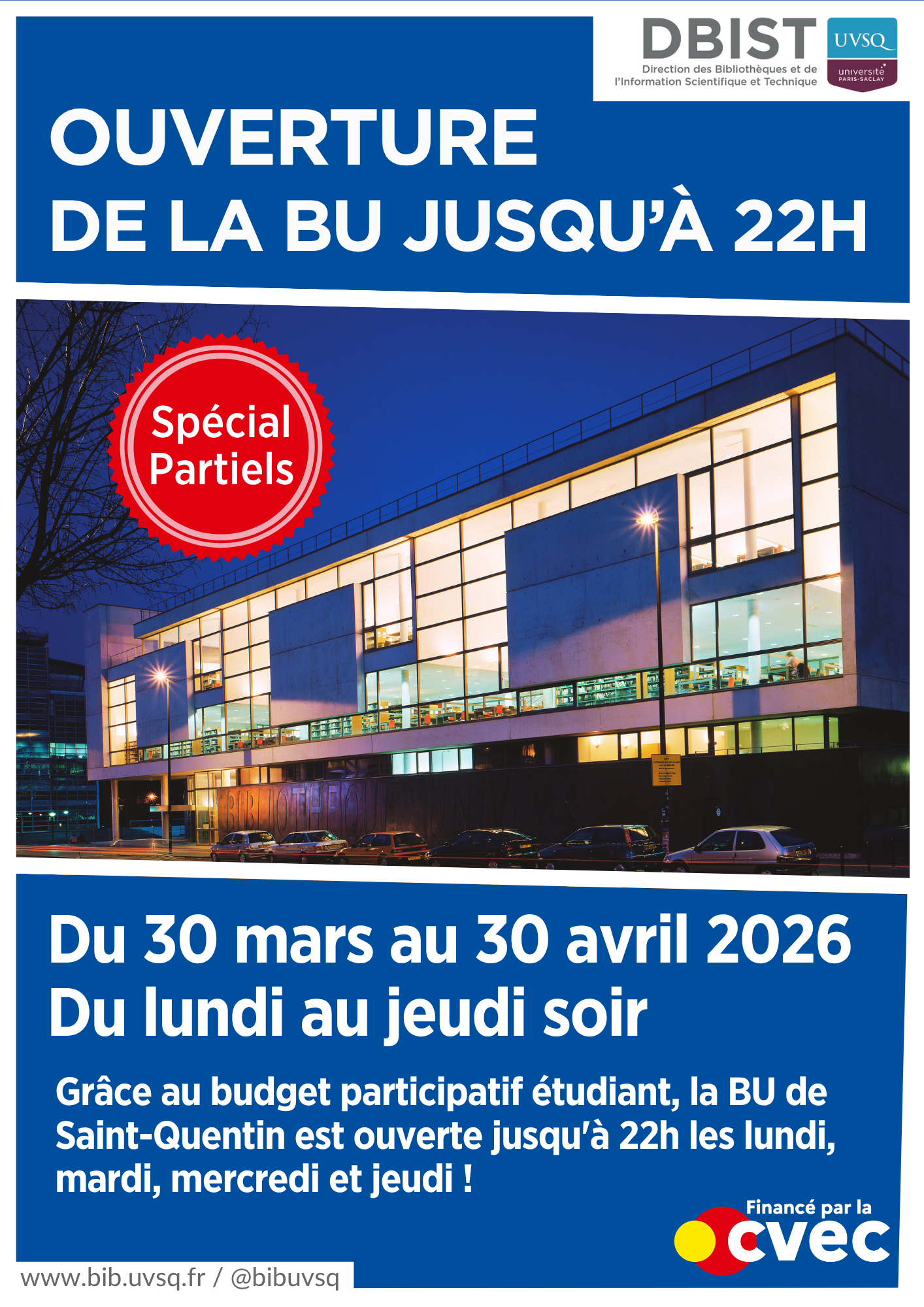 À l’occasion des partiels, la BU de Saint-Quentin prolonge ses horaires jusqu’à 22h en semaine du 30 mars au 30 avril 2026.