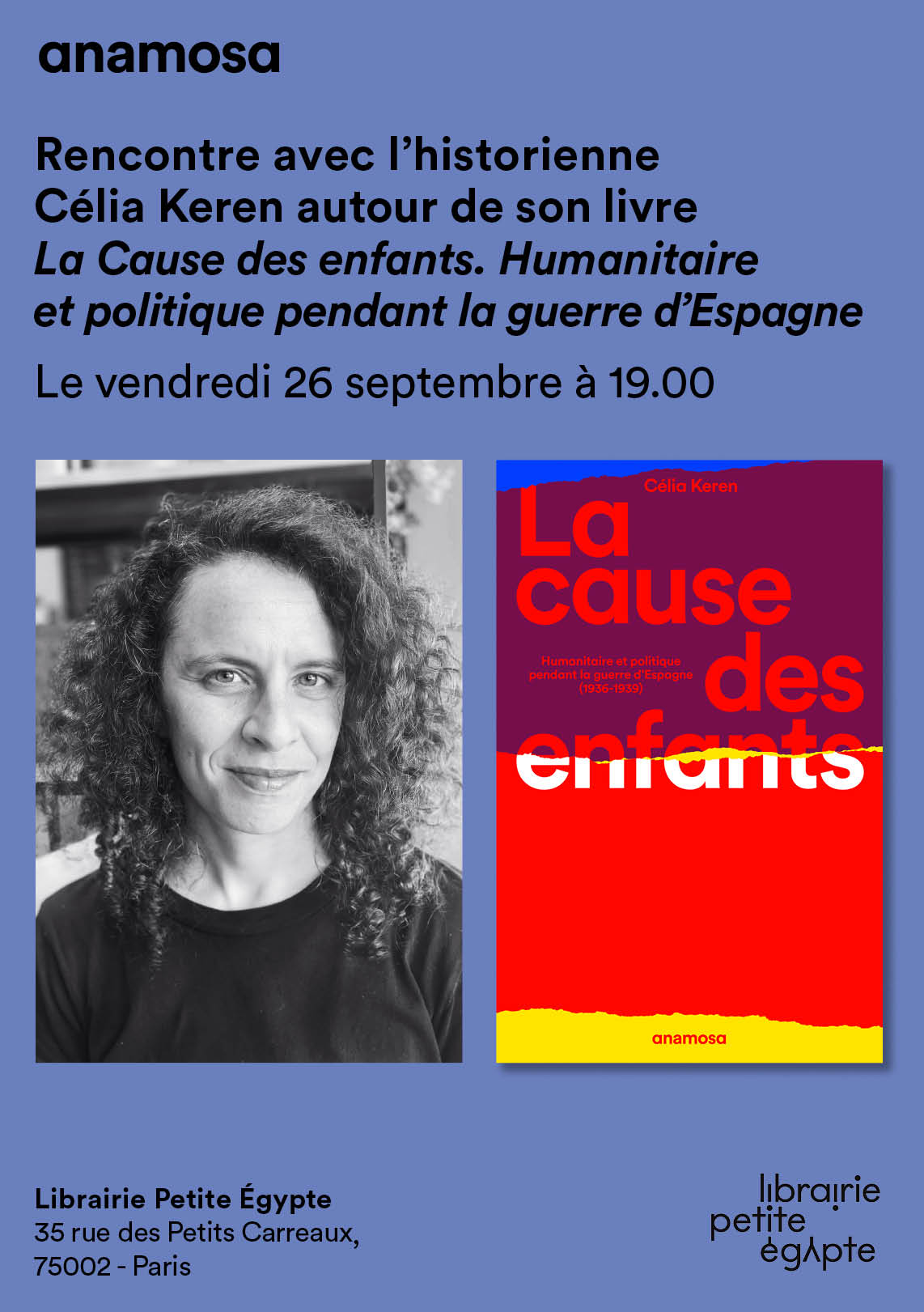 Célia Keren présentera publiquement son ouvrage La cause des enfants. Humanitaire et politique pendant la guerre d’Espagne (1936-1939) vendredi 26 septembre 2025 à 19h, à la Librairie Petite Egypte.