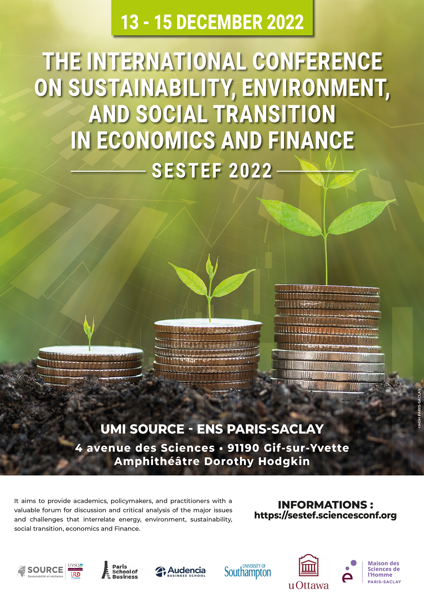 The International Conference on Sustainability, Environment, and Social Transition in Economics and Finance (SESTEF)- 2022 jointly organized by Audencia Business School, University of Southampton, University Paris-Saclay, Telfer School of Management (University of Ottawa) & Paris School of Business with the support of Gaia (Audencia Business School) & Center of Research for Energy and Climate Change - CRECC (Paris School of Business), took place on 13-14 and 15 December 2022 in Paris, France.